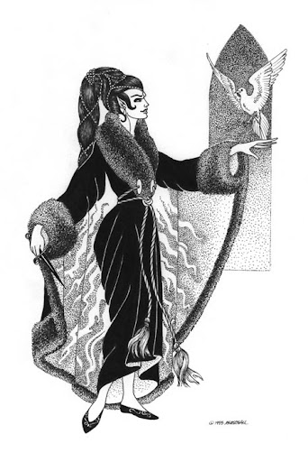 نقاشی ارت ارته تکه دوزی گلدوزی گل زن دختر ایستاده پالتو پوست کبوتر سفید محراب تاق طاق جناقی جناغی خنجر Erte Art Gallery شنل بند طناب کفش زنانه مو گیسو زلف دم دمب اسبی طراحی خطی سیاه و سفید سپید مشکی سیاهقلم حکاکی چاپی
