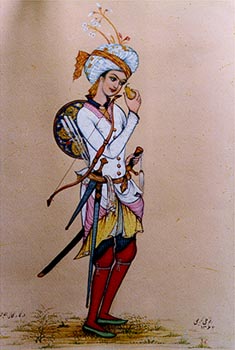پسر یا دختر نوجوان گلابی به دست ایستاده لباس سفید تیر کمان سپر چکمه قرمز عمامه سفید